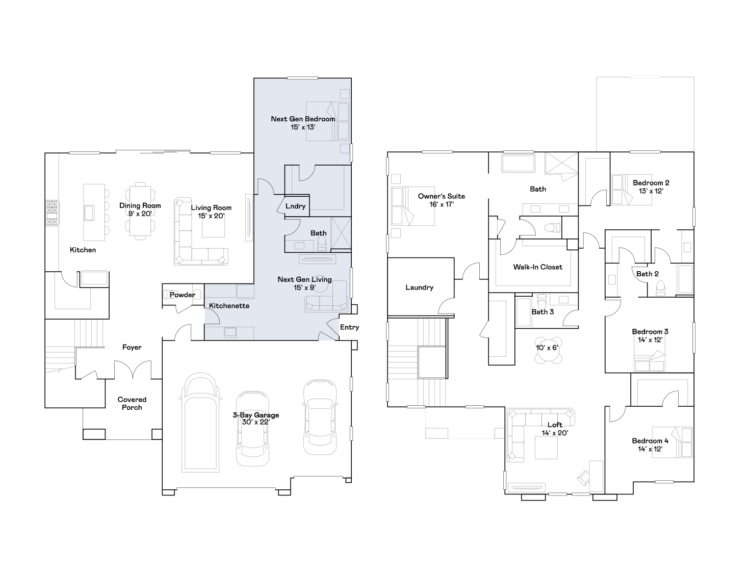 This two-story Next Gen® home features a private suite on the first floor, complete with a separate entrance, living area, kitchenette, bedroom and bathroom to encourage seamless independent living. The main area of the home is host to an inviting open-concept floorplan shared between the kitchen, living and dining areas. Four bedrooms on the second floor surround a versatile loft, including the lavish owner’s suite at the back of the home with a spa-inspired bathroom and walk-in closet.